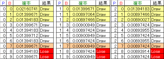 結果 となり、通常いわれている控除率(100−期待値) プレイヤー 1.24 と一致します。 また、バンカーが6で勝つ確率は5.38637159%となります。 40.47337068×(1+1)+5.38637159×(1+0.5)+9.515596802×1=98.54189554 となり、一般のバカラと比べ、期待値が低いことがわかります。 ここでもう少し深く突っ込んで考えてみます。先ほどの期待値 プレイヤー98.77% バンカー98.94% は、タイの存在を含めて考えているものです。タイはそのままバックされるため、確率的に関係ないように思えますが、あえてタイをはずして計算してみます。 プレイヤー 44.624660934/(44.624660934+45.859742263)×(1+1) =